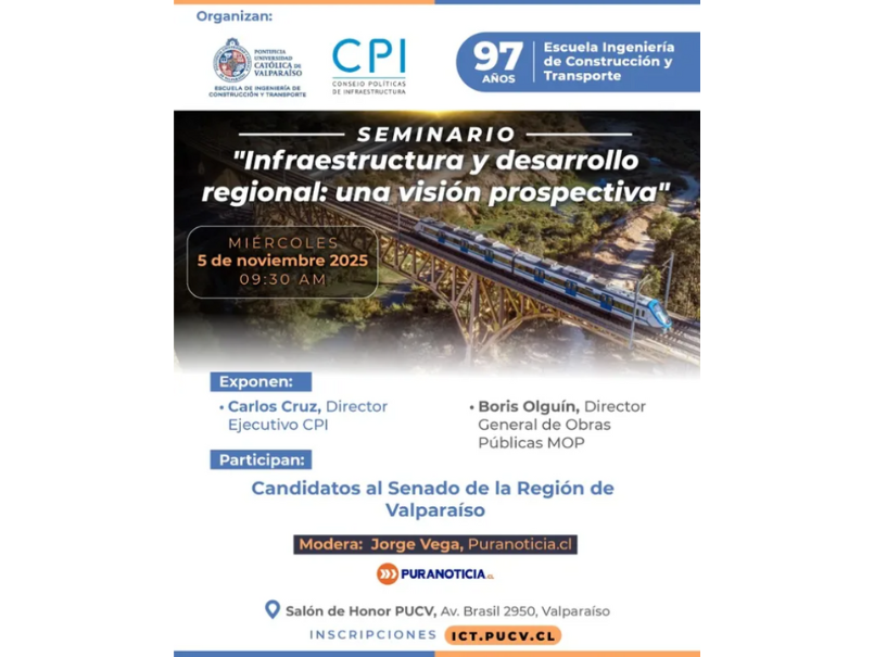 En el marco de su 97° aniversario, la Escuela de Ingeniería de Construcción y Transporte PUCV invita a participar en el seminario “Infraestructura y desarrollo regional: una visión prospectiva”, instancia que reunirá a autoridades, expertos y representantes del ámbito público para reflexionar sobre los desafíos y oportunidades que plantea el desarrollo territorial.