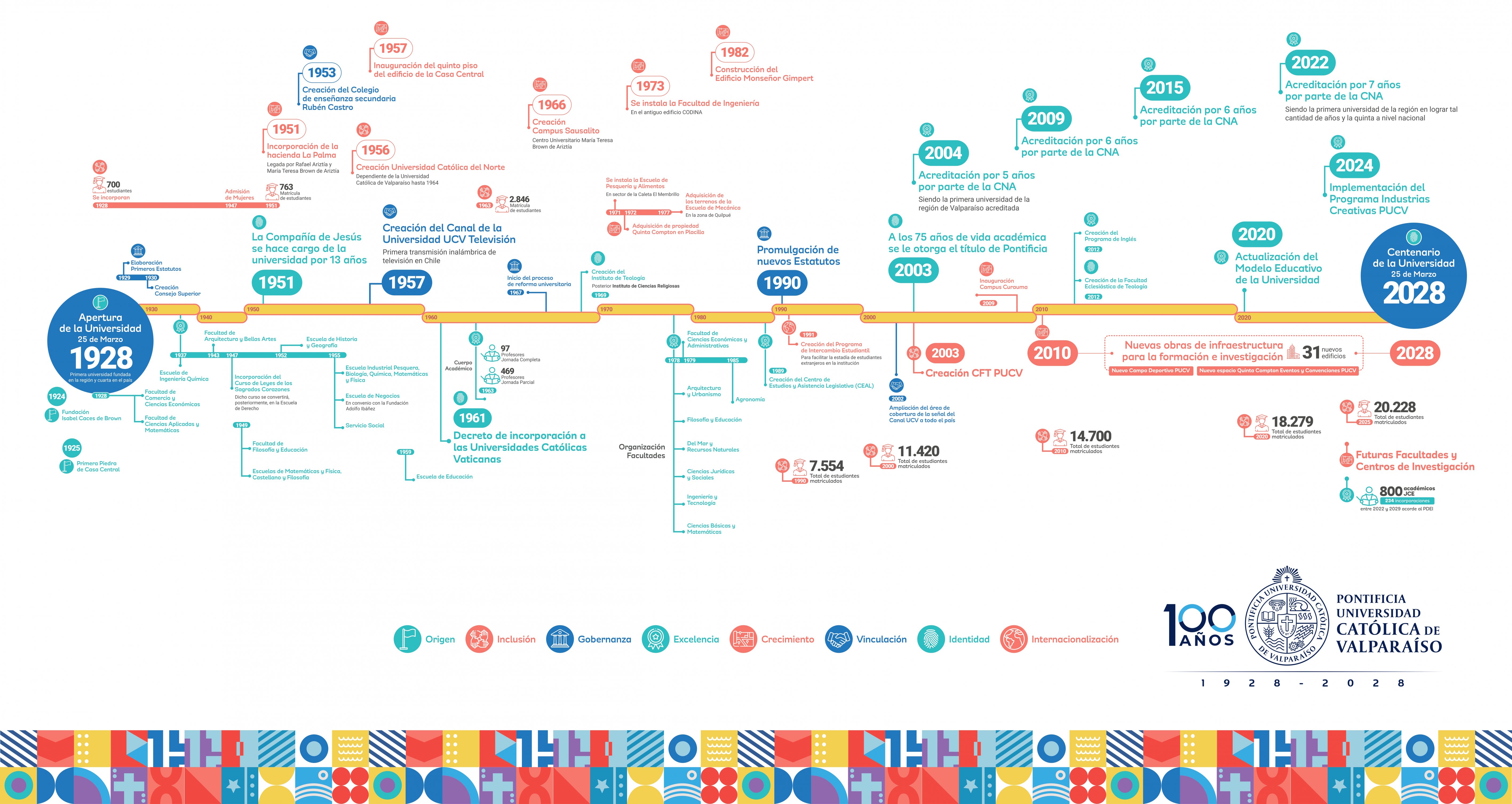 Desde el inicio de sus actividades académicas, en marzo de 1928, la Universidad Católica de Valparaíso ha desarrollado una ininterrumpida labor académica, de investigación y extensión, orientando su quehacer al cultivo de las artes, ciencia y conocimiento, siempre bajo el lema legado por sus fundadores: Fe y Trabajo.