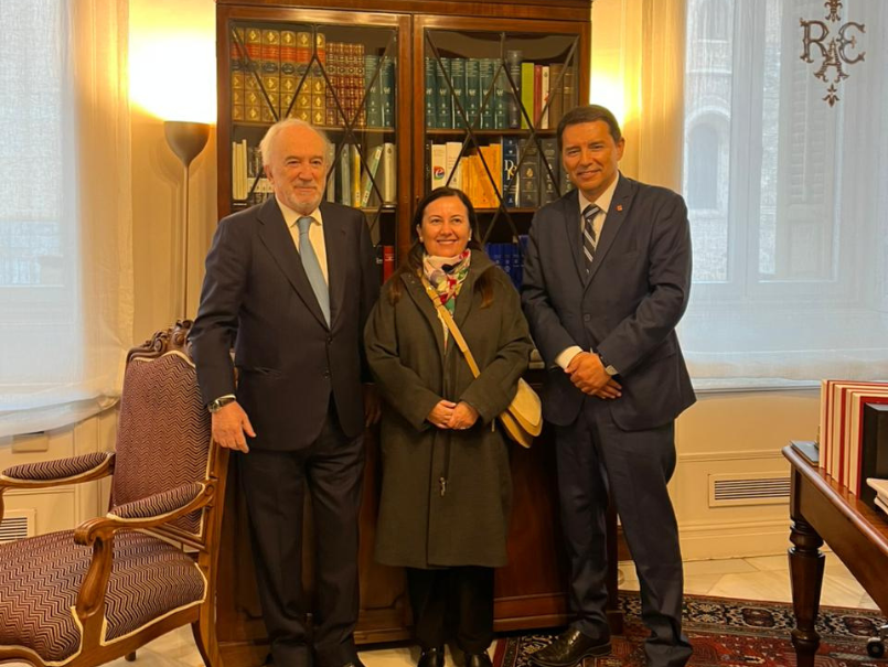 El Decano de la Facultad, Dr. José Luis Guerrero Becar y la Directora del Núcleo de Lenguaje Jurídico Claro, Dra. Claudia Poblete Olmedo, son recibidos en la ciudad de Madrid por el director de la Real Academia Española, Dr. Santiago Muñoz Machado