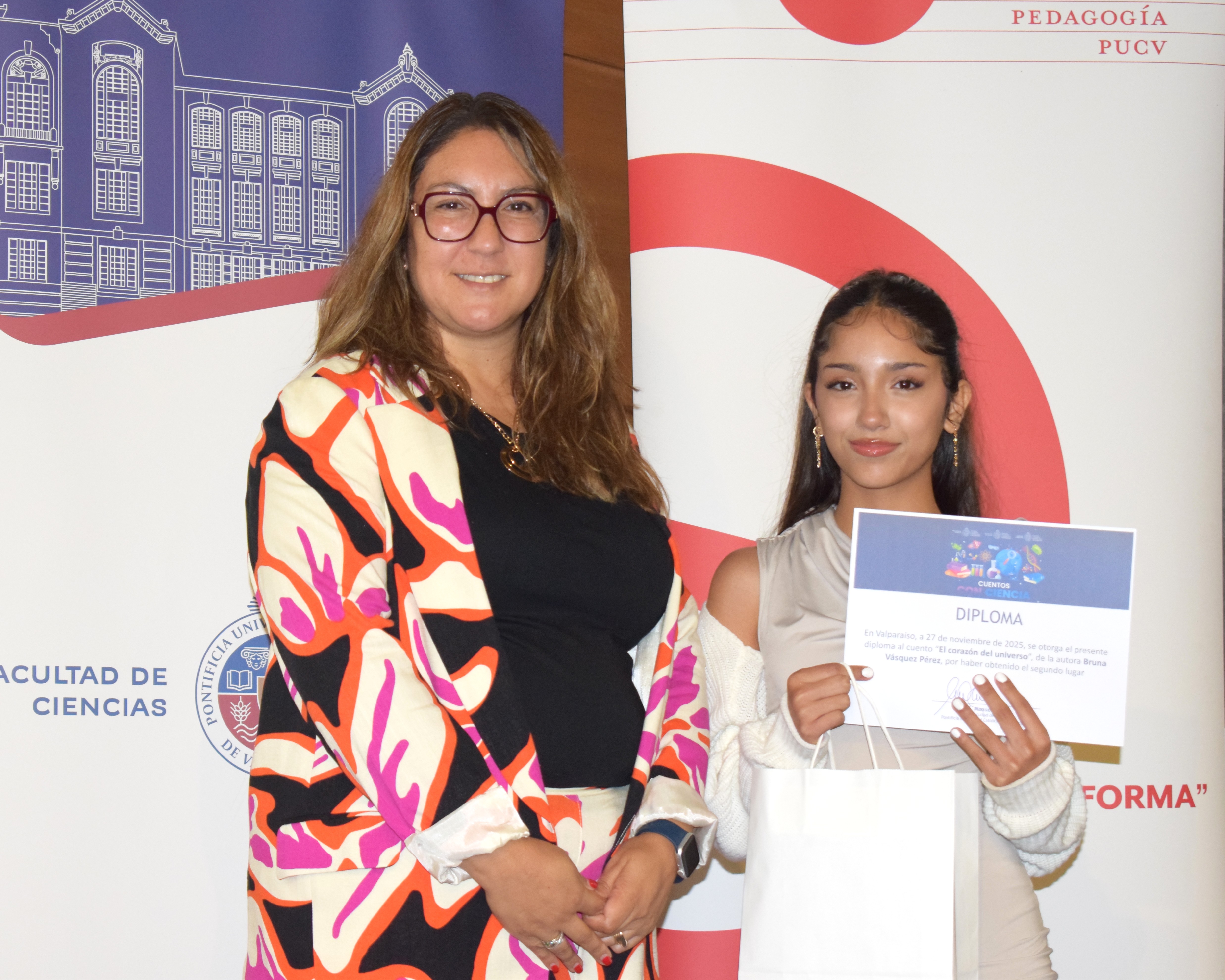 La estudiante Bruna Vásquez, ganadora del segundo lugar de la categoría 7°mo- 1°medio con su cuento “El corazón del universo”, expresó estar “encantada con la Universidad por hacer este tipo de concursos, porque motivan mucho a los niños y estudiantes a progresar en varios aspectos, como la ciencia y la escritura, me encanta que puedan hacer estos momentos muy agradables para todas las personas”.