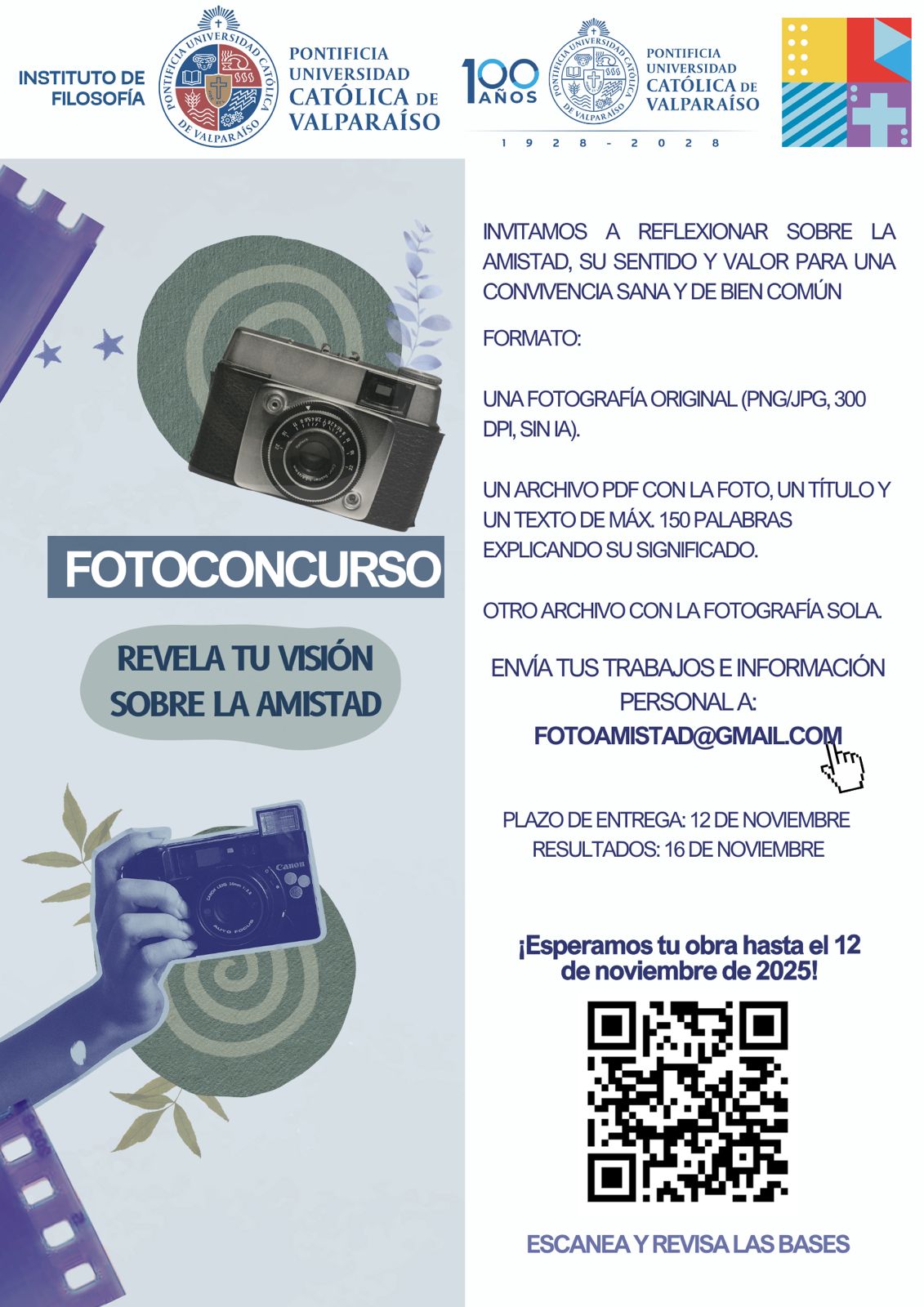 El Instituto de Filosofía de la Pontificia Universidad Católica de Valparaíso lanzó oficialmente la convocatoria del Fotoconcurso “Revela tu visión sobre la amistad”, una iniciativa que invita a explorar, a través de la creatividad visual, el significado de la amistad y su aporte a una convivencia sana y orientada al bien común.