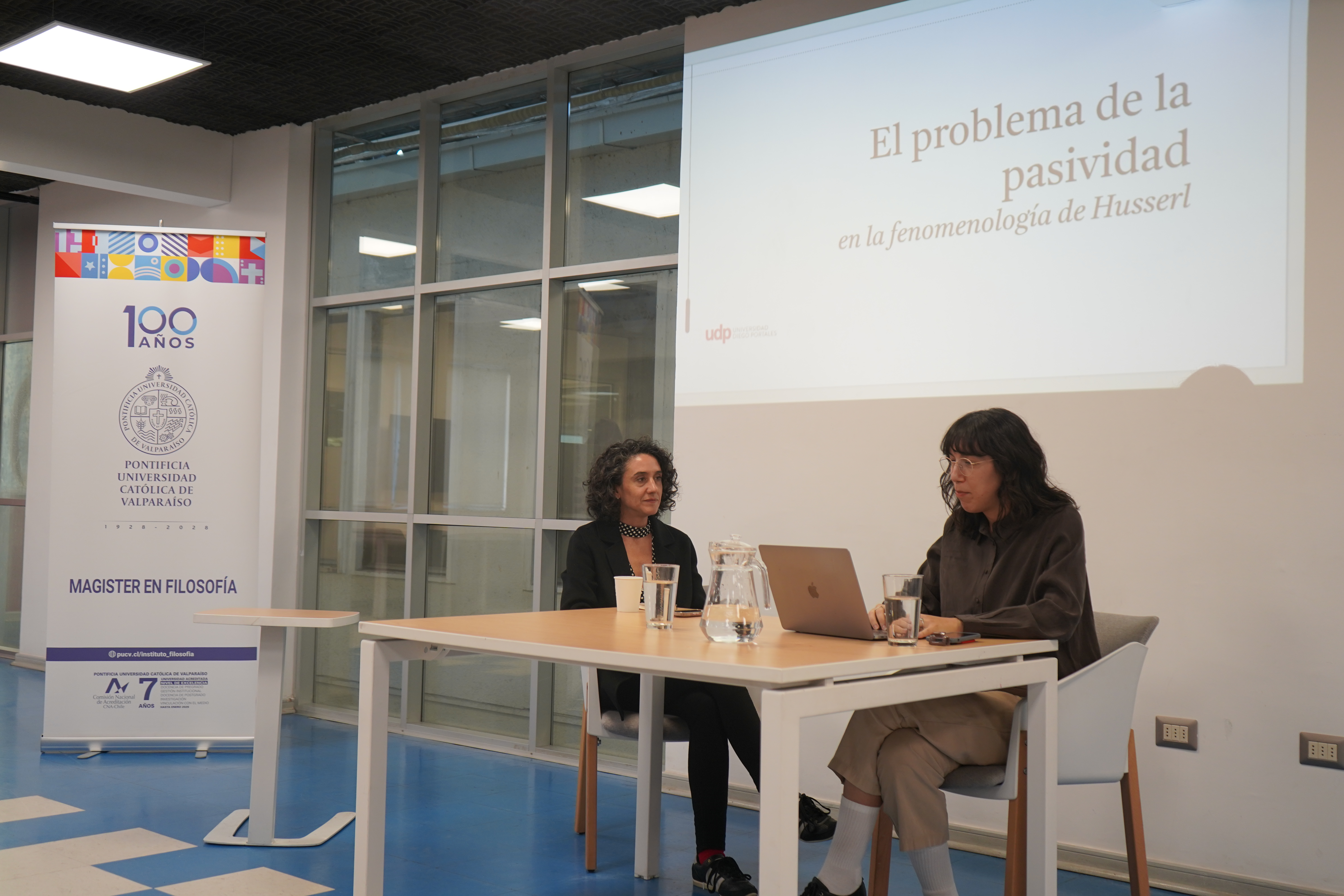 El coloquio culminó con la conferencia de cierre de la Dra. Celeste Vecino, académica de la Universidad Diego Portales, titulada “El problema de la pasividad en la fenomenología de Edmund Husserl”. En su intervención, la profesora propuso comprender la pasividad como un problema de carácter epistemológico, metodológico y ético. “Hay una pugna entre el sujeto activo y el sujeto pasivo, y finalmente esa tensión se resuelve dando un lugar fundamental a la pasividad”, señaló.