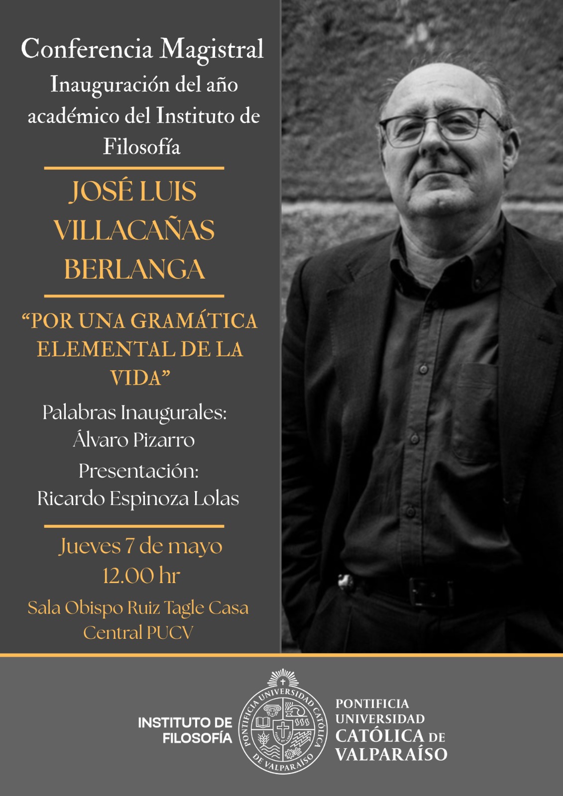 El Instituto de Filosofía PUCV invita a toda la comunidad a participar de la inauguración de su año académico 2026. En esta instancia se celebrará una Conferencia Magistral a cargo del prof. Dr. José Luis Villacañas titulada "Por una gramática elemental de la vida", la que contará con palabras inaugurales del Director del Instituto de Filosofía PUCV prof. Dr. Álvaro Pizarro Herrmann, y será presentada por el prof. Dr. Ricardo Espinoza Lolas. La actividad se encuentra abierta a todo público.