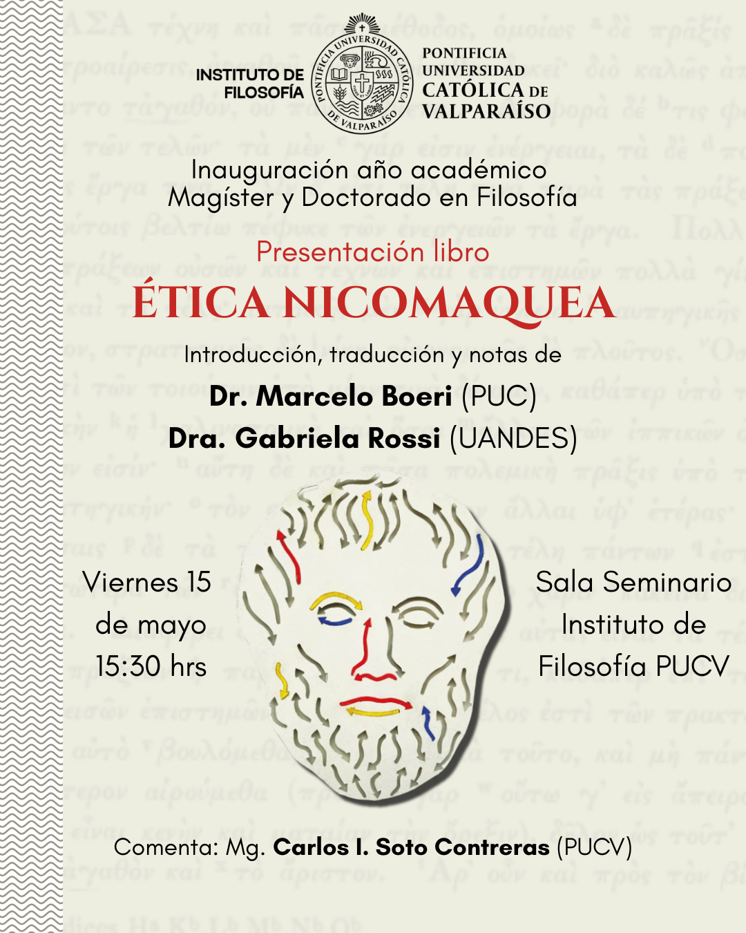 El Instituto de Filosofía PUCV tiene el agrado de invitar a toda la comunidad educativa a la inauguración del año académico 2026 de los programas de Magíster y Doctorado en Filosofía. En esta ocasión se realizará la presentación de la traducción (acompañada de una robusta introducción y de notas) de la Ética Nicomaquea (2024, PUZ) de Aristóteles a cargo de los destacados especialistas Dr. Marcelo Boeri (PUC) y la Dra. Gabriela Rossi (UANDES).