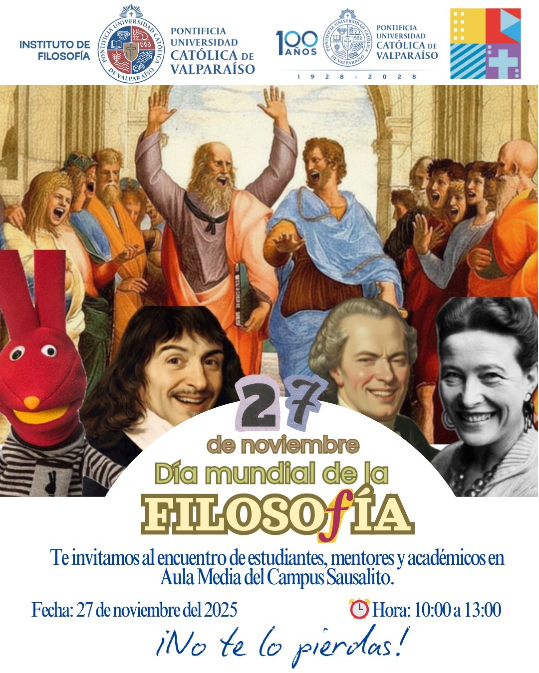 El Núcleo Pedagógico perteneciente al Instituto de Filosofía de la Pontificia Universidad Católica de Valparaíso, tiene el agrado de invitarle a participar como expositor/a en la Conmemoración del Día Mundial de la Filosofía, instancia que busca fortalecer los vínculos con las comunidades educativas y reconocer el aporte de docentes y colaboradores en la formación filosófica escolar y universitaria.