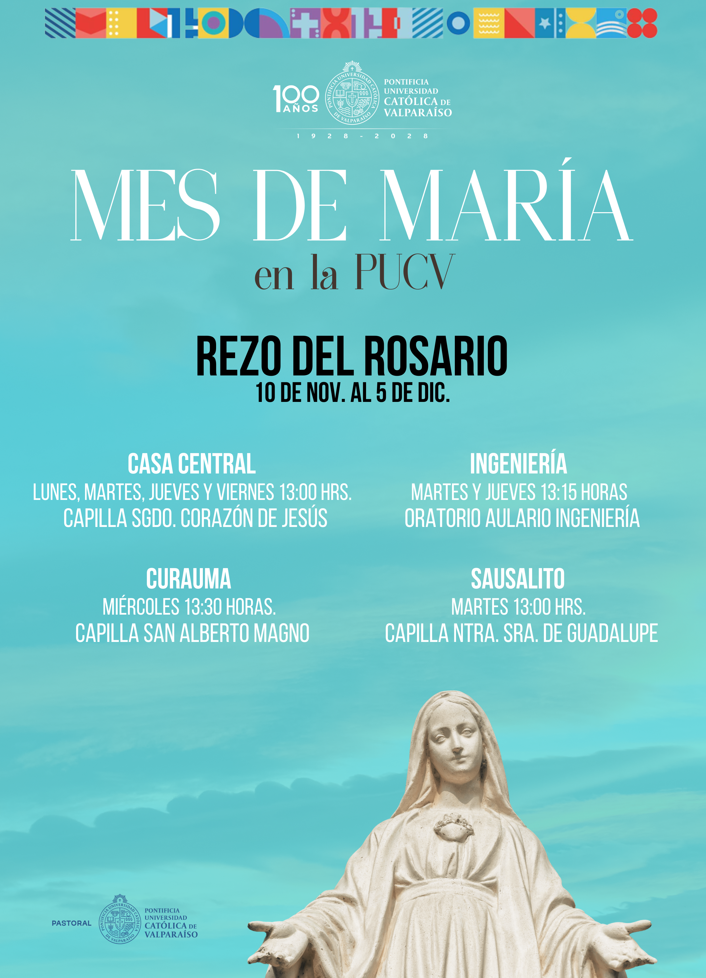 Durante noviembre, la Pastoral PUCV celebrará el Mes de María en todos los barrios pastorales de la Universidad. Será un tiempo especial de oración, encuentro y gratitud, en el que estudiantes, funcionarios y académicos están invitados a honrar a la Virgen María y a renovar juntos su fe desde los distintos campus y sedes.