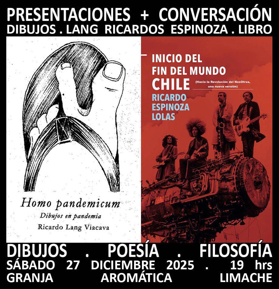 Encuentro en torno a la obra gráfica Homo pandemicum de Ricardo Lang y al libro Inicio del fin del mundo: Chile de Ricardo Espinoza Lolas, que articula reflexión filosófica, experiencia política y creación artística.