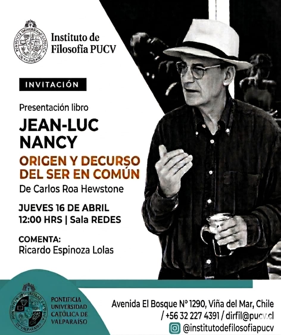 El Instituto de Filosofía PUCV invita a toda la comunidad a participar de la presentación del libro "Jean-Luc Nancy. Origen y decurso del ser en común" del Dr. Carlos Roa Hewstone
