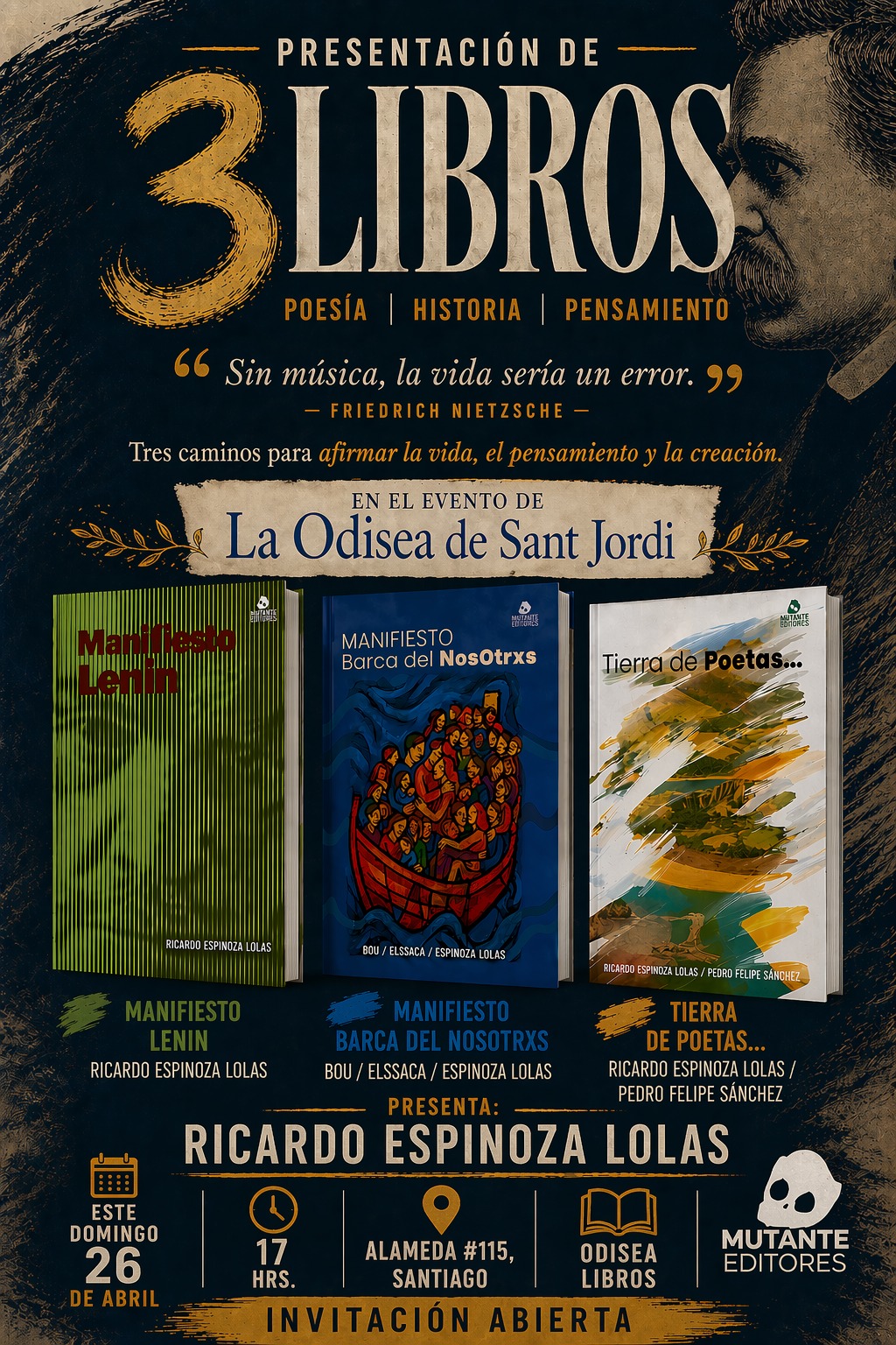 El domingo 26 de abril en Odisea Libros, el profesor del IFIL PUCV, Dr. Ricardo Espinoza, presentará tres libros: Manifiesto Lenin; Manifiesto. Barca del NosOtrxs (Bou, Elssaca, Espinoza Lolas); y Tierra de poetas... (Espinoza Lolas, Sánchez). La actividad será abierta a todo público, y se realizará en Odisea Libros, ubicada en Alameda #115, Santiago.