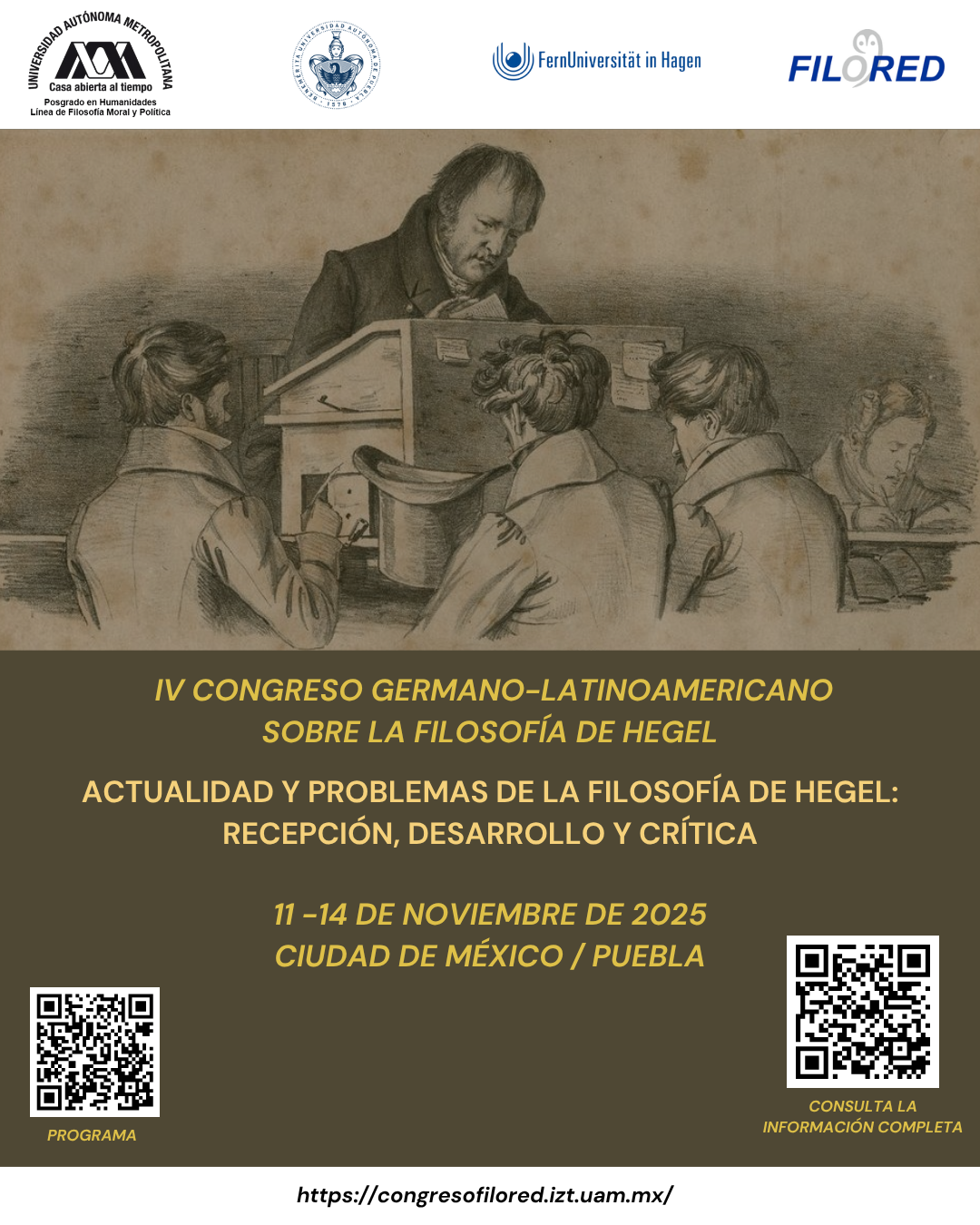 El Profesor Titular de nuestro Instituto de Filosofía, Dr. Hardy Neumann, se encuentra participando en calidad de conferencista en el IV Congreso Germano Latinoamericano sobre la Filosofía de Hegel: "Actualidad y problemas de la Filosofía de Hegel: recepción, desarrollo y crítica". La actividad, organizada en el marco de la Red Germano-Latinoamericana de Investigación y Doctorado en Filosofía FILORED, tuvo lugar entre los días 11 y 14 de noviembre en Ciudad de México y Puebla.