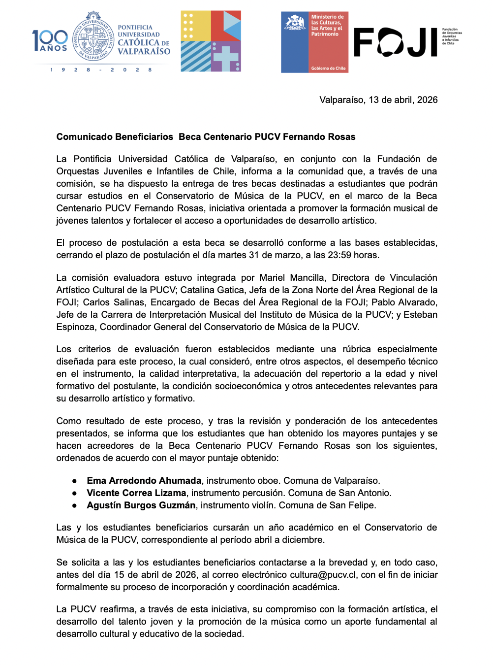 Usted está en: Portada | Extensión Cultural Se anuncian resultados de la Beca Centenario PUCV Fernando Rosas Twittear subir volver